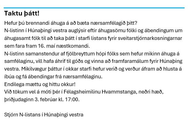 Á döfinni Gallery Á döfinni Auglýsingar Á döfinni selasetur2026-02-03T20:13:50+00:0028. January 2026| Read More